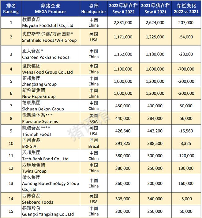 中國歷來是養豬大國,但大到什么程度,99%的小伙伴不知道。本年度的全球養豬企業排行榜(母豬存欄10萬頭及以上)有42家公司上榜,分別來自9個國家,其中中國19家,占比42%,新上榜4家,分別是海大集團、鐵騎力士集團、廣西桂墾牧業和深圳金新農;美國11家,與2021年一致。巴西4家,西班牙和俄羅斯各2家,法國、智利、泰國和加拿大各1家。中國、美國和巴西包攬了排名前20的所有企業。